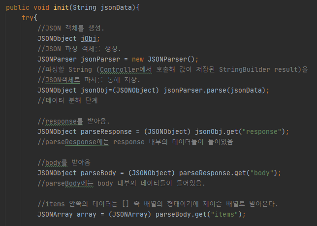 Controller에서 넘어온 result.toString()인 jsonData를 JSONParser를 통해 분해하는 과정입니다. 2.